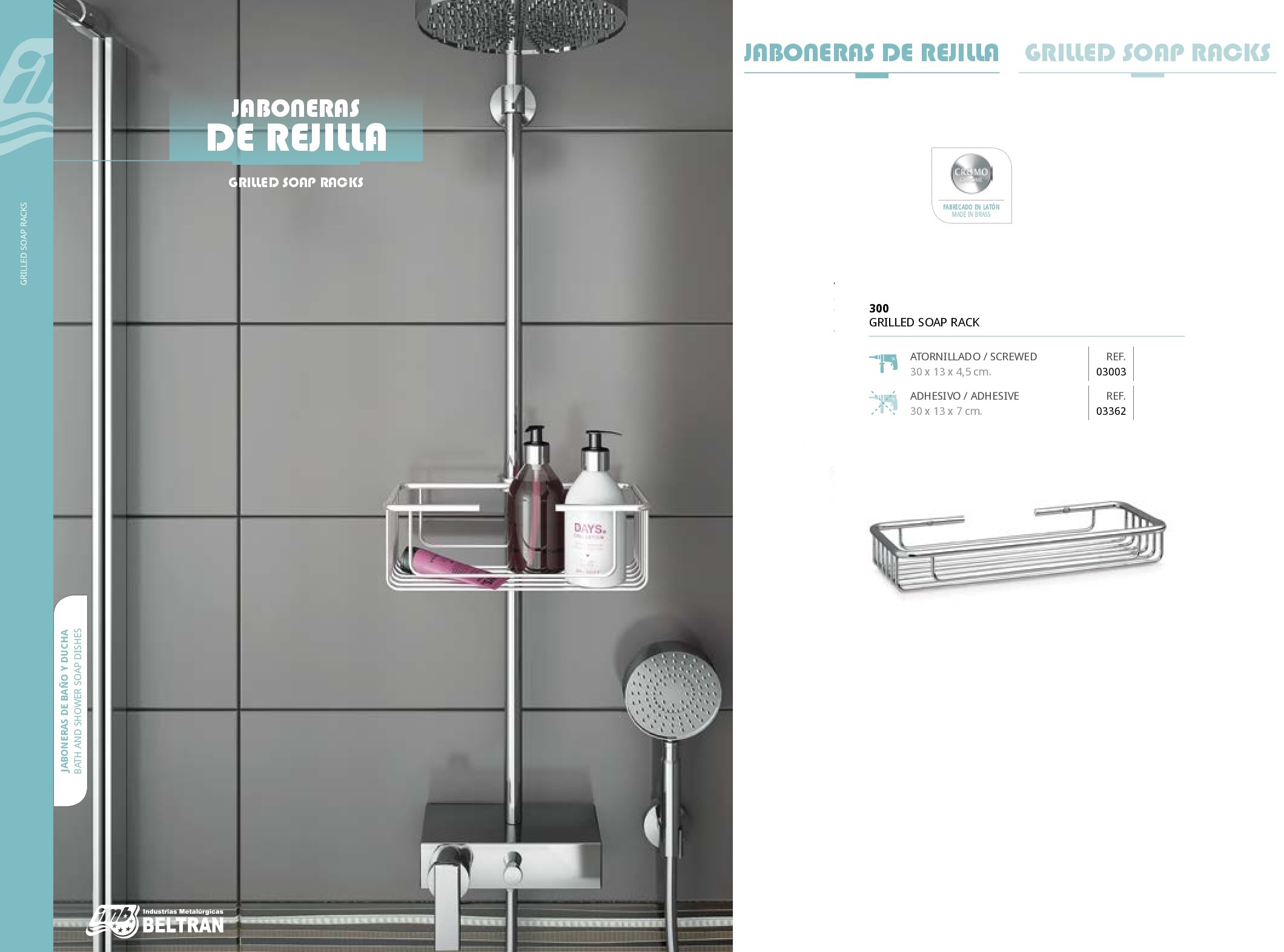 300 Rejilla Jaboneras de ducha y baño Medidas 30 x 13 x 4,50 cm (atornillado) 30 x 13 x 7 (adhesivo) Referencias 03003, 03362 Serie Jaboneras Rejilla Acabados Sistema de Fijación Materiales de Fabricación Fabricado en Latón. 180 Rejilla 300 Profunda Rejilla