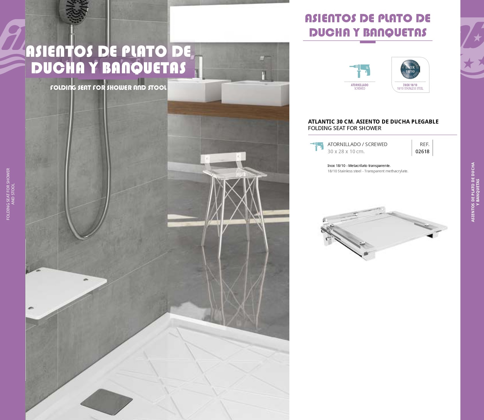 Atlantic 30 cm. Asiento Ducha Plegable Toalleros, banquetas, asientos de ducha y toalleros Medidas 30 x 28 x 10 cm Referencias 02618 Serie Asientos de Plato de Ducha y Banquetas. Acabados Sistemas de Fijación Materiales de Fabricación Fabricado en Acero Inoxidable. Metacrilato transparente. Percha Inox 18/10 Atlantic 35 cm. Asiento de Ducha Plegable