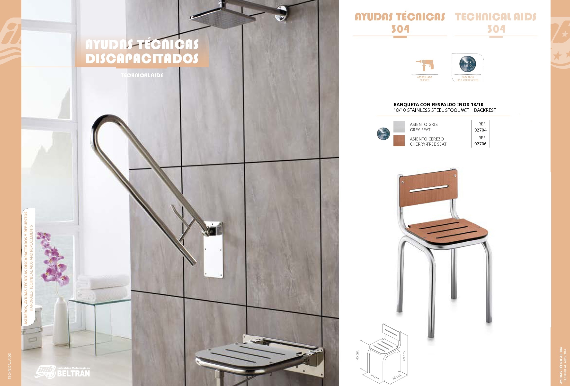 Banqueta con Respaldo Inox 18/10 Asideros de ducha y ayudas técnicas para discapacitados Medidas 69 x 38 x 45 x 35 cm.. Referencias 02704, 02706 Serie Ayudas Técnicas 304. Acabados Sistemas de Fijación Sección de Asideros y Ayudas Técnicas Materiales de Fabricación Fabricado en Acero Inoxidable Banqueta sin Respaldo Inox 18/10 Asiento Abatible Plato Ducha y otros servicios Inox 18/10