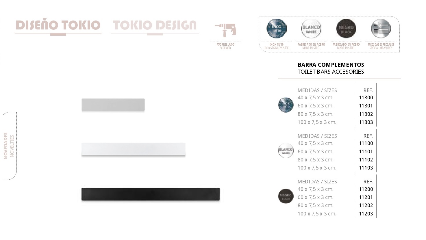 Barra Complementos Tokio Últimas tendencias Medidas 40 x 7,50 x 3 / 6 cm 60 x 7,50 x 3 / 6 cm 80 x 7,50 x 3 / 6 cm 100 x 7,50 x 3 / 6 cm Referencias 11300, 11301, 11302, 11303 11100,11101, 11102, 11103 11200, 11201, 11202, 11203 Serie Diseño Tokio Acabados Materiales de Fabricación Fabricado en Acero Inoxidable Vaso para colgar 2 Barra Complementos Toallero Tokio