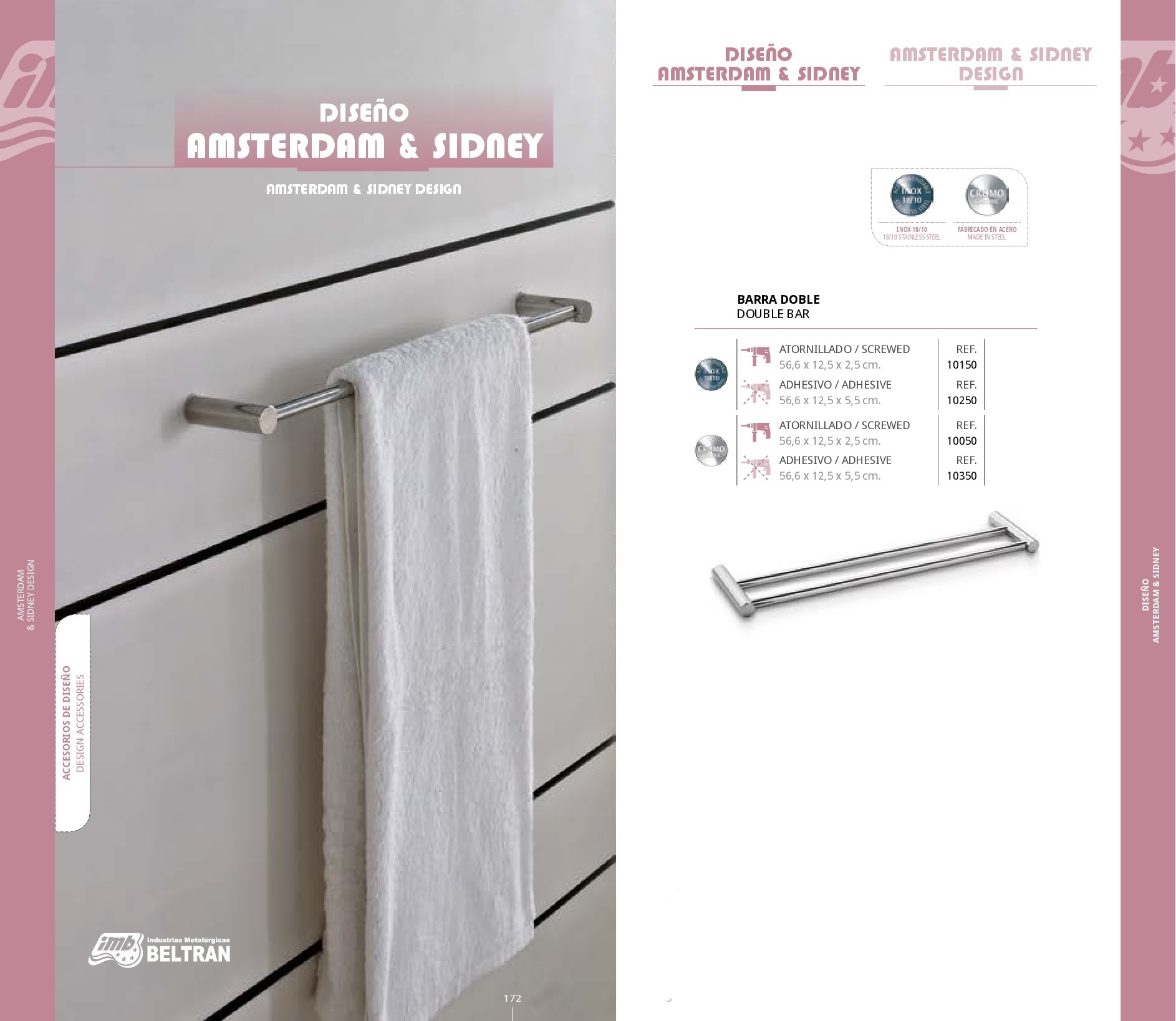 Barra Doble Amsterdam & Sidney Accesorios de diseño Medidas 56,60 x 12,50,x 2,50 cm. Referencias 10150, 10250, 10050, 10350 Serie Diseño Amsterdam & Sidney. Acabados Sistemas de Fijación Materiales de Fabricación Fabricado en Acero. Barra Doble Articulada Amsterdam & Sidney Barra Amsterdam & Sidney