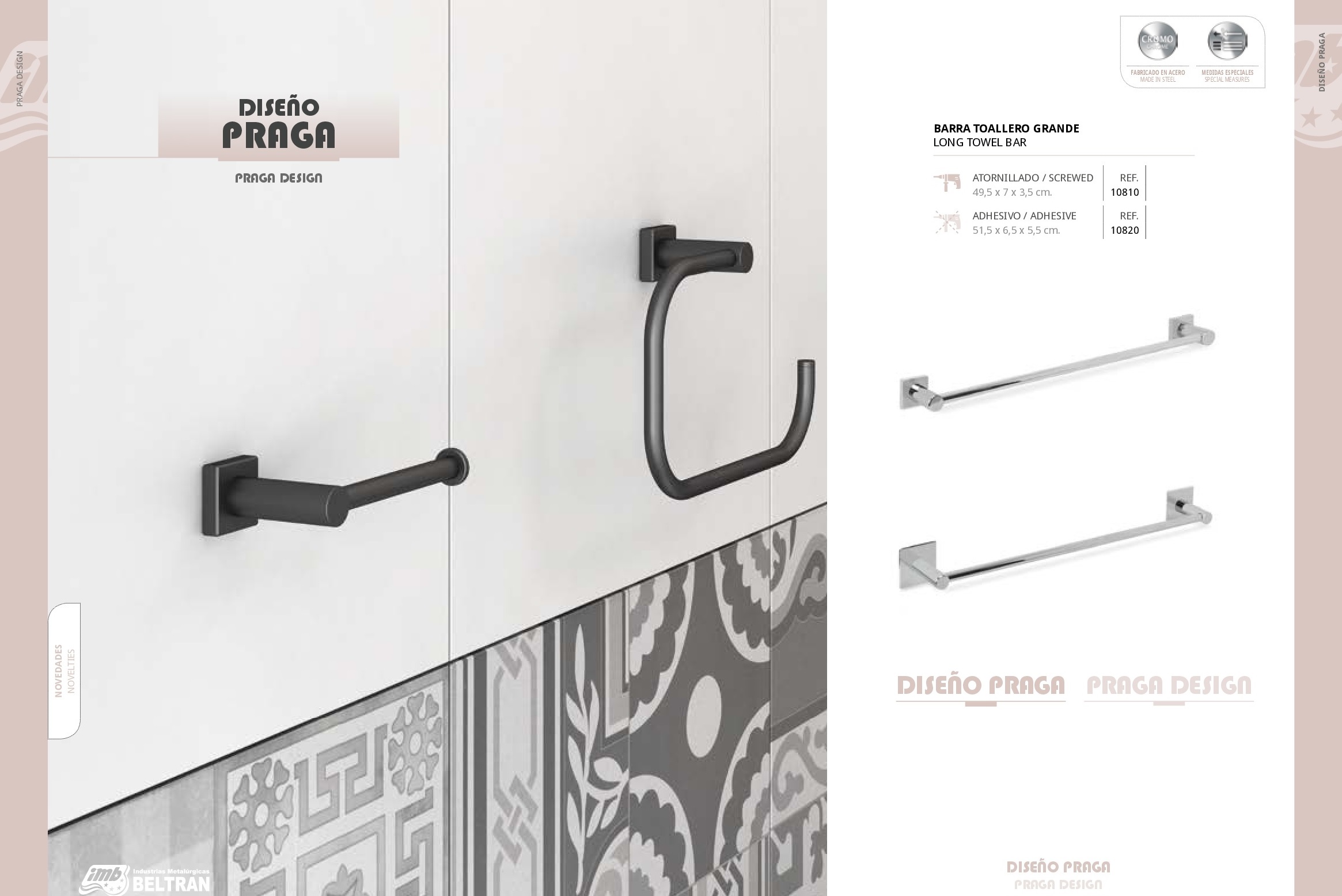 Barra Toallero Grande Praga Últimas tendencias Medidas 49,50 x 7 x 3,50 cm (Atornillado) 51,50 x 6,50 x 5,50 cm (Adhesivo) Referencias 10810, 10820 Serie Diseño Praga Acabados Sistemas de Fijación Materiales de Fabricación Fabricado en Acero Inoxidable Portarollo con Repuesto Bolonia Dubai Toallero de Hotel Recto Pletina