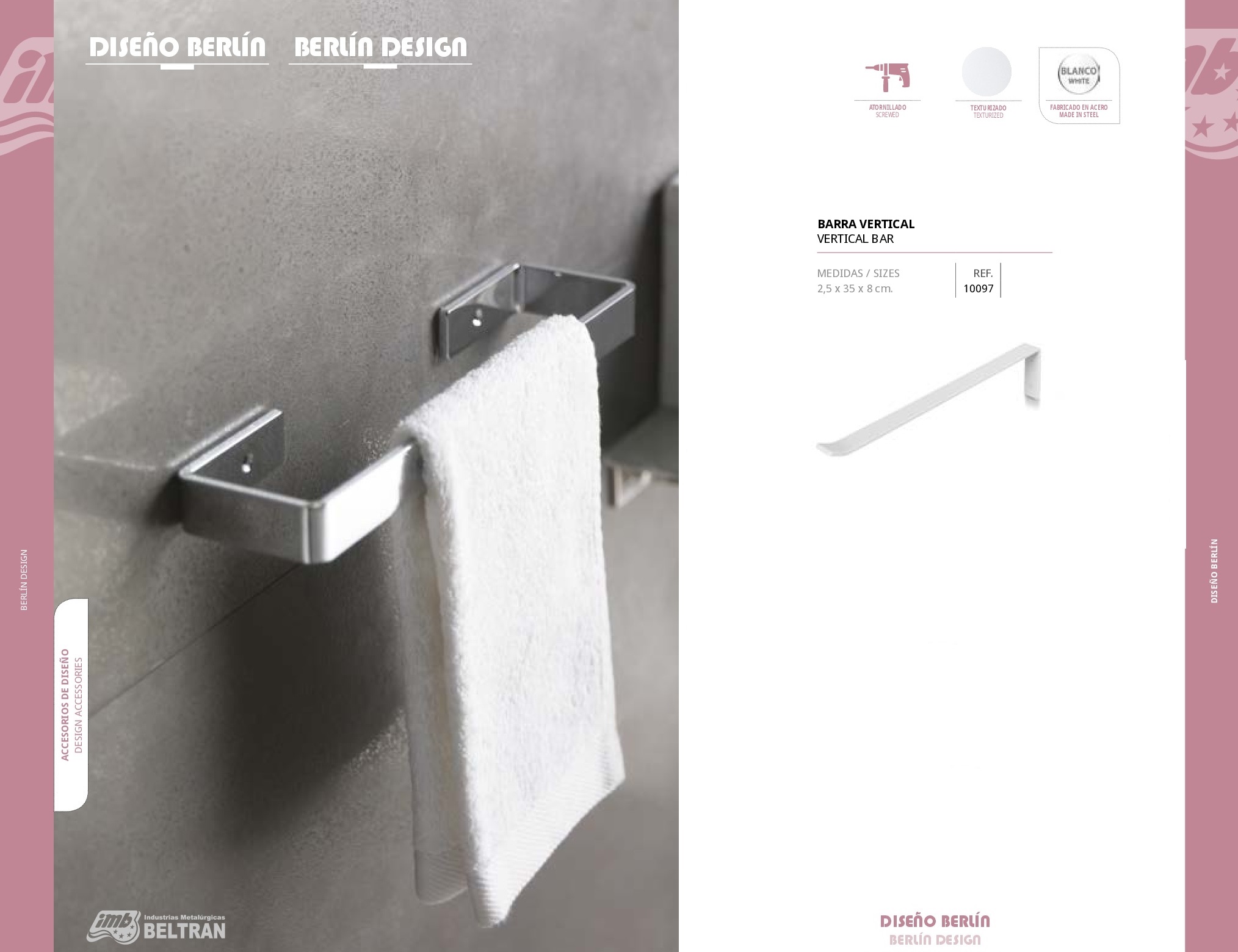 Barra Vertical Berlín Accesorios de diseño Medidas 2,50 x 35 x 8 cm. Referencias 10097 Serie Diseño Berlín. Acabados Sistemas de Fijación Materiales de Fabricación Fabricado en Acero. Barra Toallero Berlín Barra Vertical Berlín