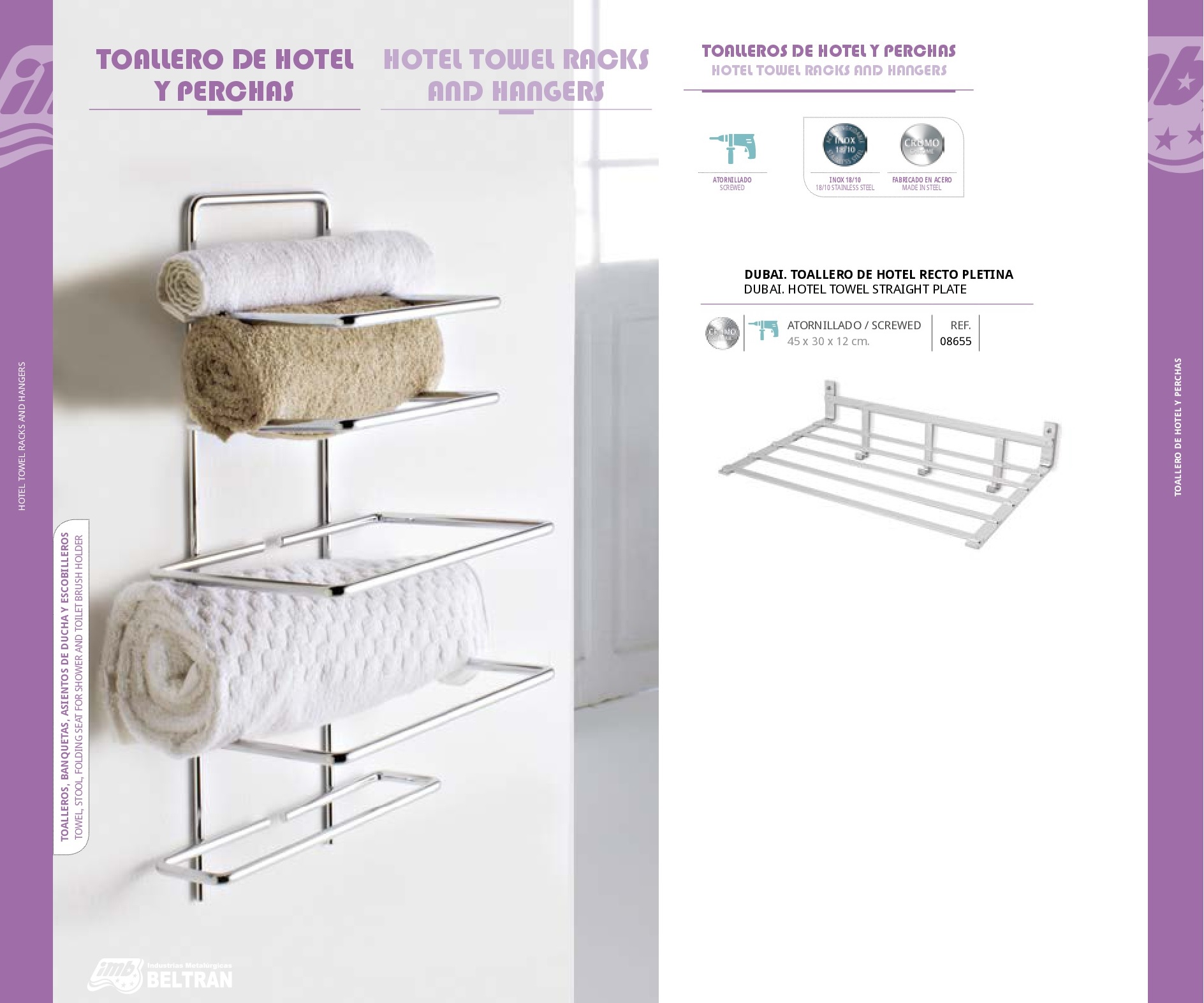 Dubai Toallero de Hotel Recto Pletina Toalleros, banquetas, asientos de ducha y toalleros Medidas 45 x 30 x 12 cm (atornillado) Referencias 08655 Serie Toallero de Hotel y Perchas Acabados Sistema de Fijación Materiales de Fabricación Fabricado en Acero. Barra Toallero Grande Praga Barra Toallero Blanca Praga