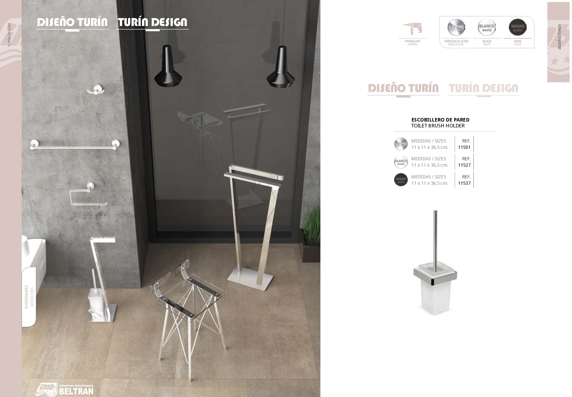 Escobillero de Pared Turin Últimas tendencias Medidas 11 x 11 x 36,50 cm Referencias 10501, 10527, 10537 Serie Diseño Turín Acabados Sistemas de Fijación Materiales de Fabricación Fabricado en Acero Inoxidable Toallero con Bandeja Solid Surface y Defensa Turin Toallero Anilla Lavabo-Bidé Bolonia