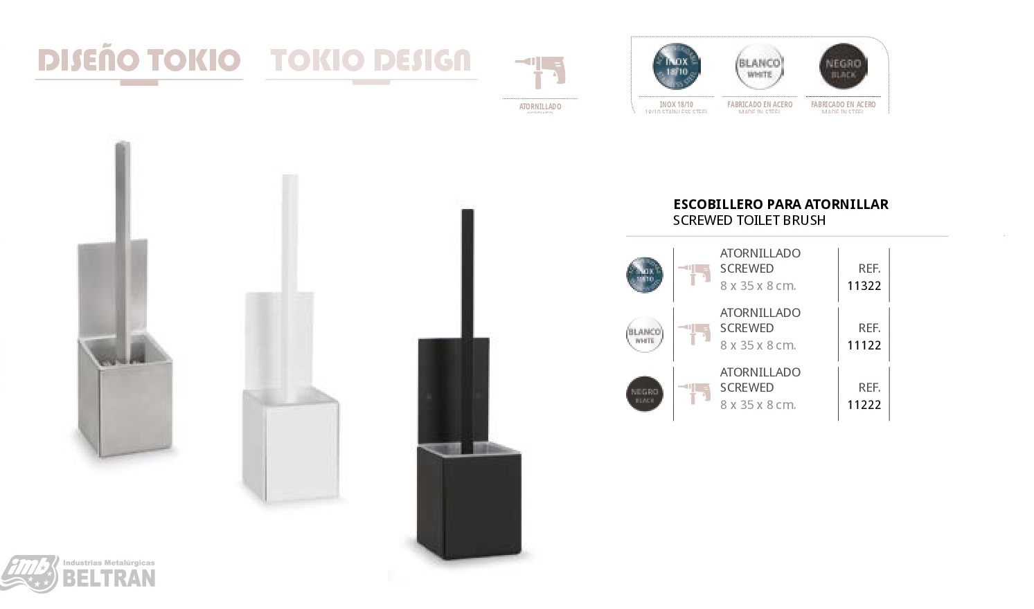 Escobillero para Atornillar Tokio Últimas tendencias Medidas 8 x 35 x 8 cm Referencias 11322, 11122 , 11222 Serie Diseño Tokio Acabados Sistema de Fijación Materiales de Fabricación Fabricado en Acero Inoxidable Repuesto de Papel para Colgar Tokio Repuesto de Papel de Pared para Atornillar Tokio