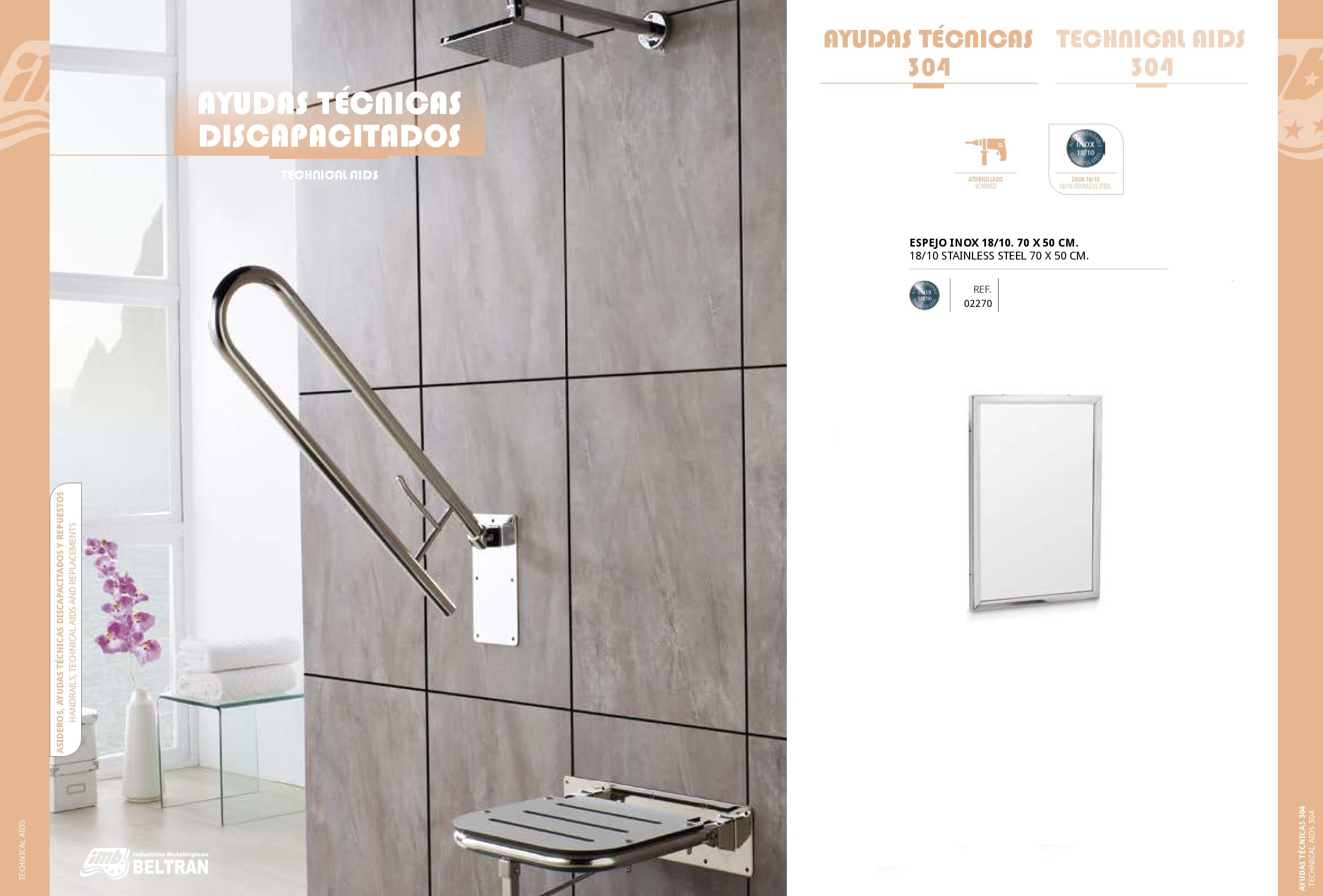 Espejo Inox 18/10 Asideros de ducha y ayudas técnicas para discapacitados Medidas 70 x 50 cm.. Referencias 02270 Serie Ayudas Técnicas 304. Acabados Sistemas de Fijación Materiales de Fabricación Fabricado en Acero Inoxidable Asidero Pared Fijo Inox 18/10 Banqueta sin Respaldo Inox 18/10