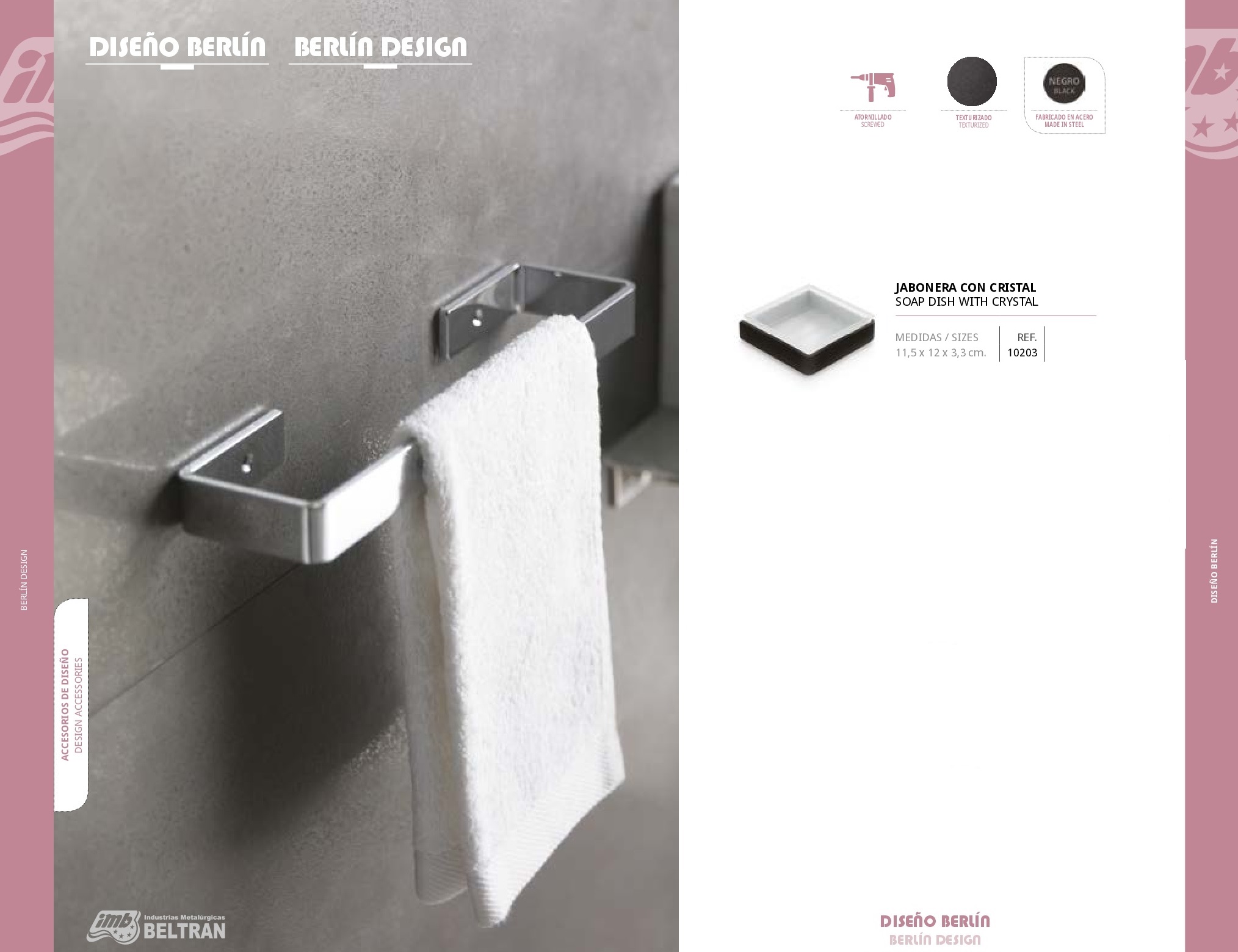 Jabonera con Cristal Berlín Accesorios de diseño Medidas 11,50 x 12 x 3,30 cm. Referencias 10203 Serie Diseño Berlín. Acabados Sistemas de Fijación Materiales de Fabricación Fabricado en Acero. Jabonera con Cristal Berlín Escobillero Berlín