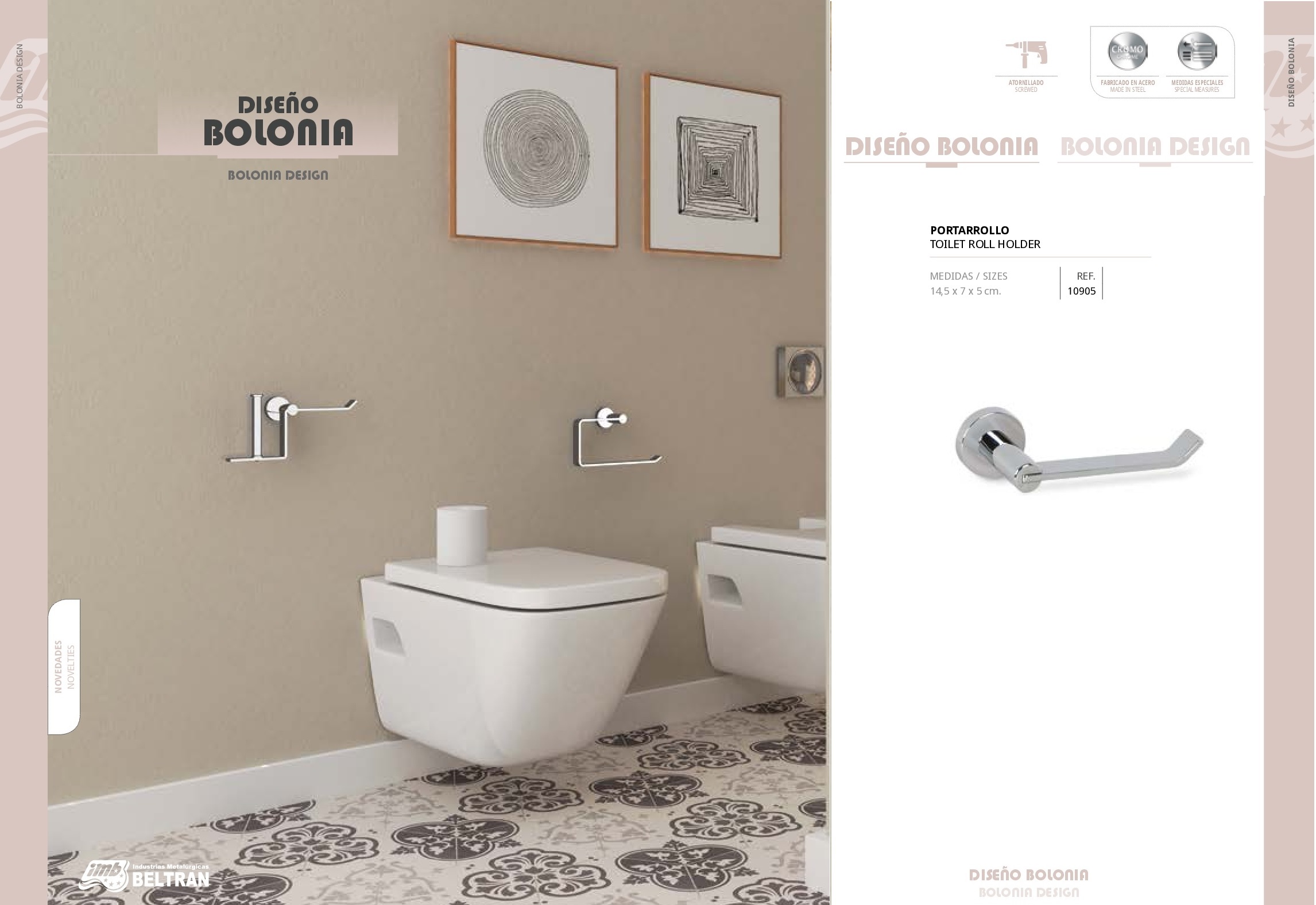 Portarollo Bolonia Últimas tendencias Medidas 14,50 x 7,x 5 cm Referencias 10905 Serie Diseño Bolonia Acabados Sistemas de Fijación Materiales de Fabricación Fabricado en Acero Inoxidable Anilla Recta Bolonia Jabonera Bolonia