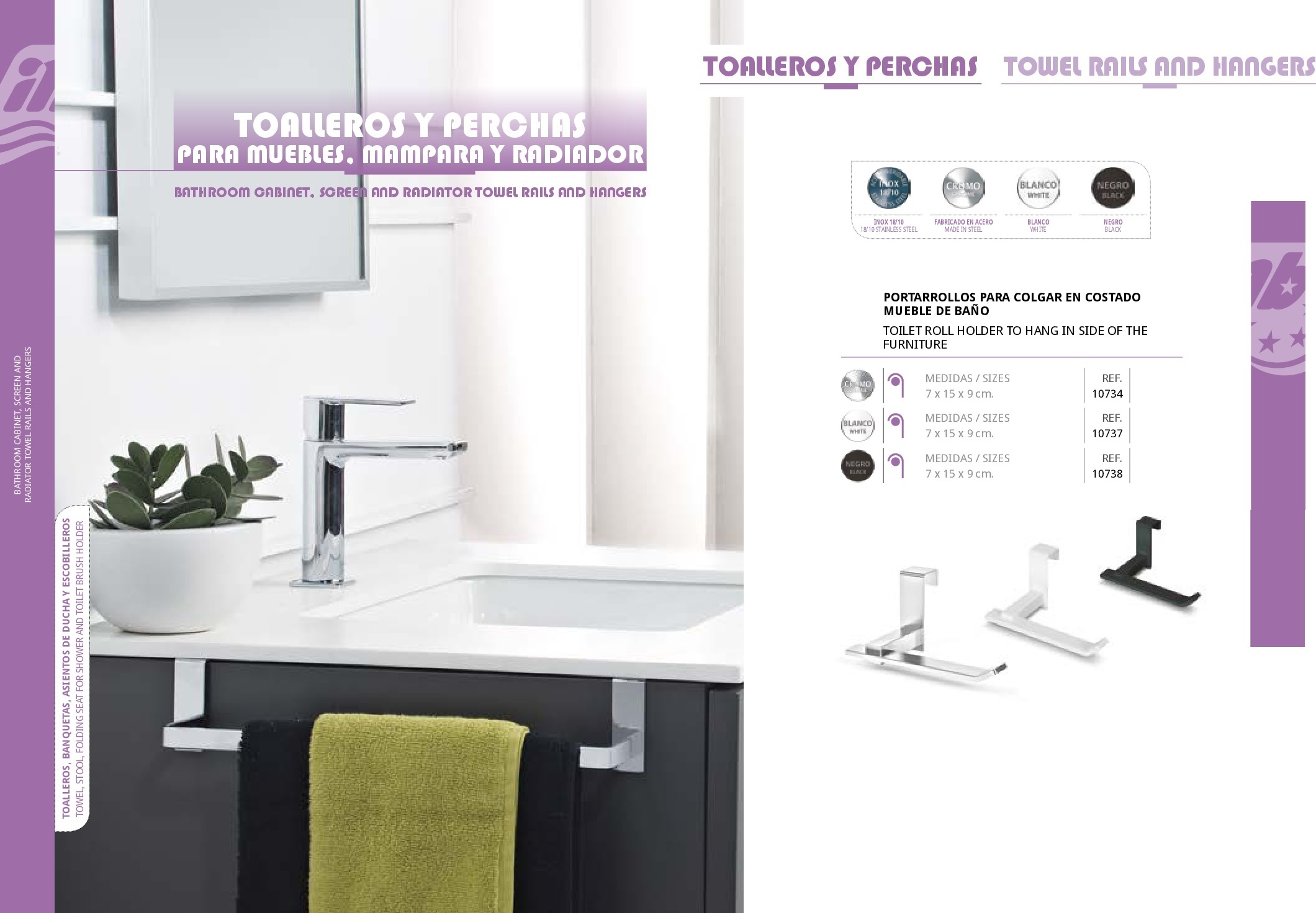Portarollos para colgar en costado mueble de baño Toalleros, banquetas, asientos de ducha y toalleros Medidas 7 x 15 x 9 cm 7 x 15 x 9 cm 7 x 15 x 9 cm Referencias 10734, 10737 , 10738 Serie Toalleros y perchas. Acabados Sistemas de Fijación Materiales de Fabricación Fabricado en Acero Inoxidable Jabonera de Acero Inox 18/10 Percha para colgar en Jabonera o Mámpara