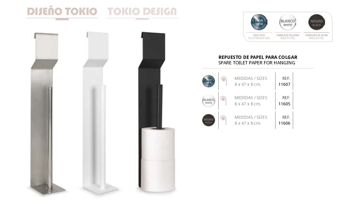 Repuesto de Papel para Colgar Tokio Últimas tendencias Medidas 8 x 47 x 8 cm Referencias 11607, 11605 , 11606 Serie Diseño Tokio Acabados Sistema de Fijación Materiales de Fabricación Fabricado en Acero Inoxidable Escobillero para Colgar Tokio Escobillero para Atornillar Tokio