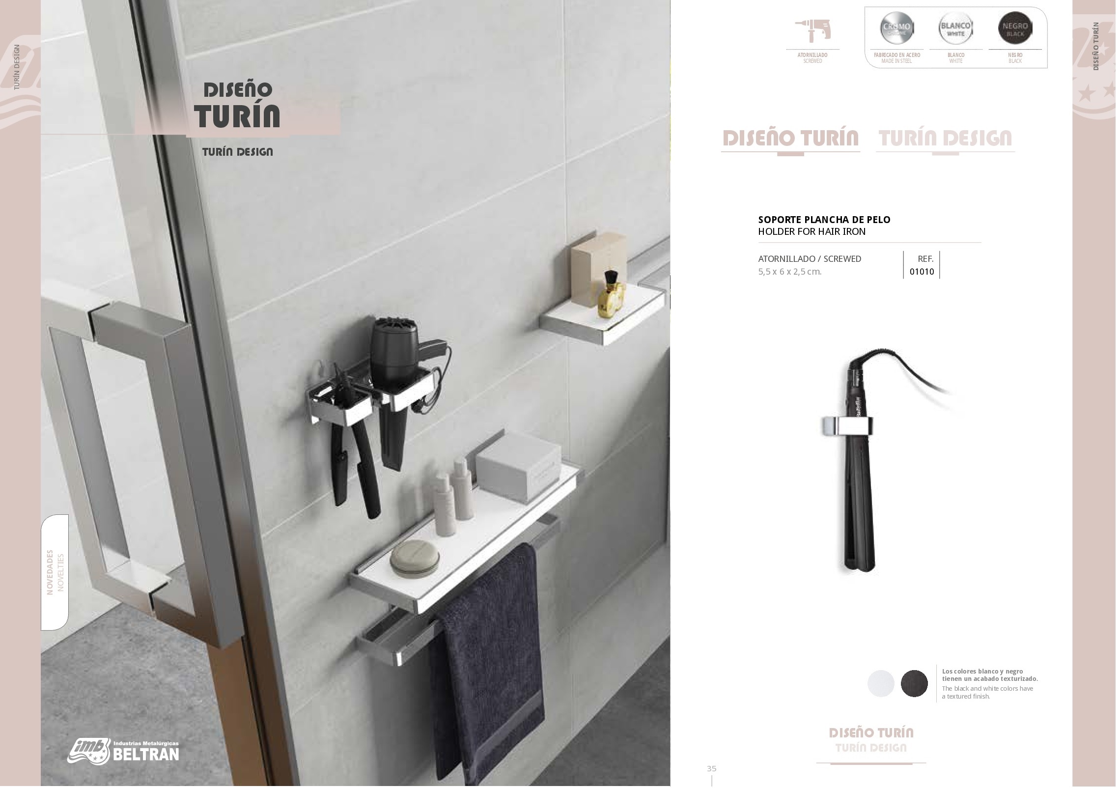 Soporte Plancha de Pelo Turin Últimas tendencias Medidas 5,50 x 6 x 2,50 cm Referencias 01010 Serie Diseño Turín Acabados Sistemas de Fijación Materiales de Fabricación Fabricado en Acero Inoxidable Soporte Secador Turín Estantería con Barandilla Turin
